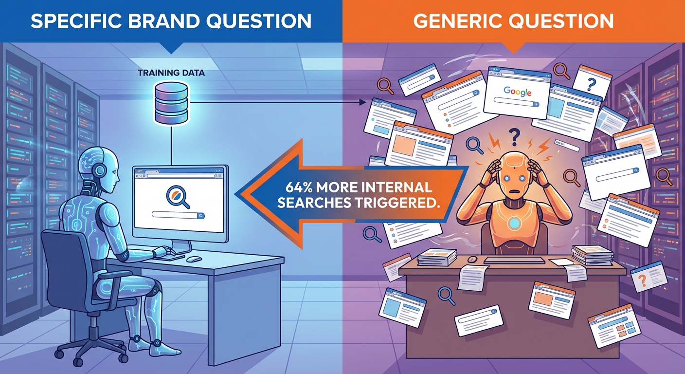 Generic prompts triggered 64% MORE internal searches than brand-specific ones.