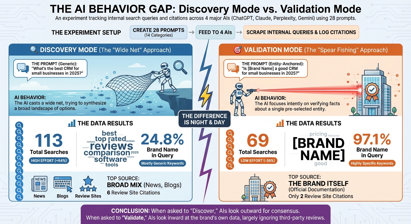 When you ask a generic question, the AI goes into Discovery Mode. It casts a wide net, searching for "best [category] 2025," "top rated [category]," and "reviews." It's looking for consensus.