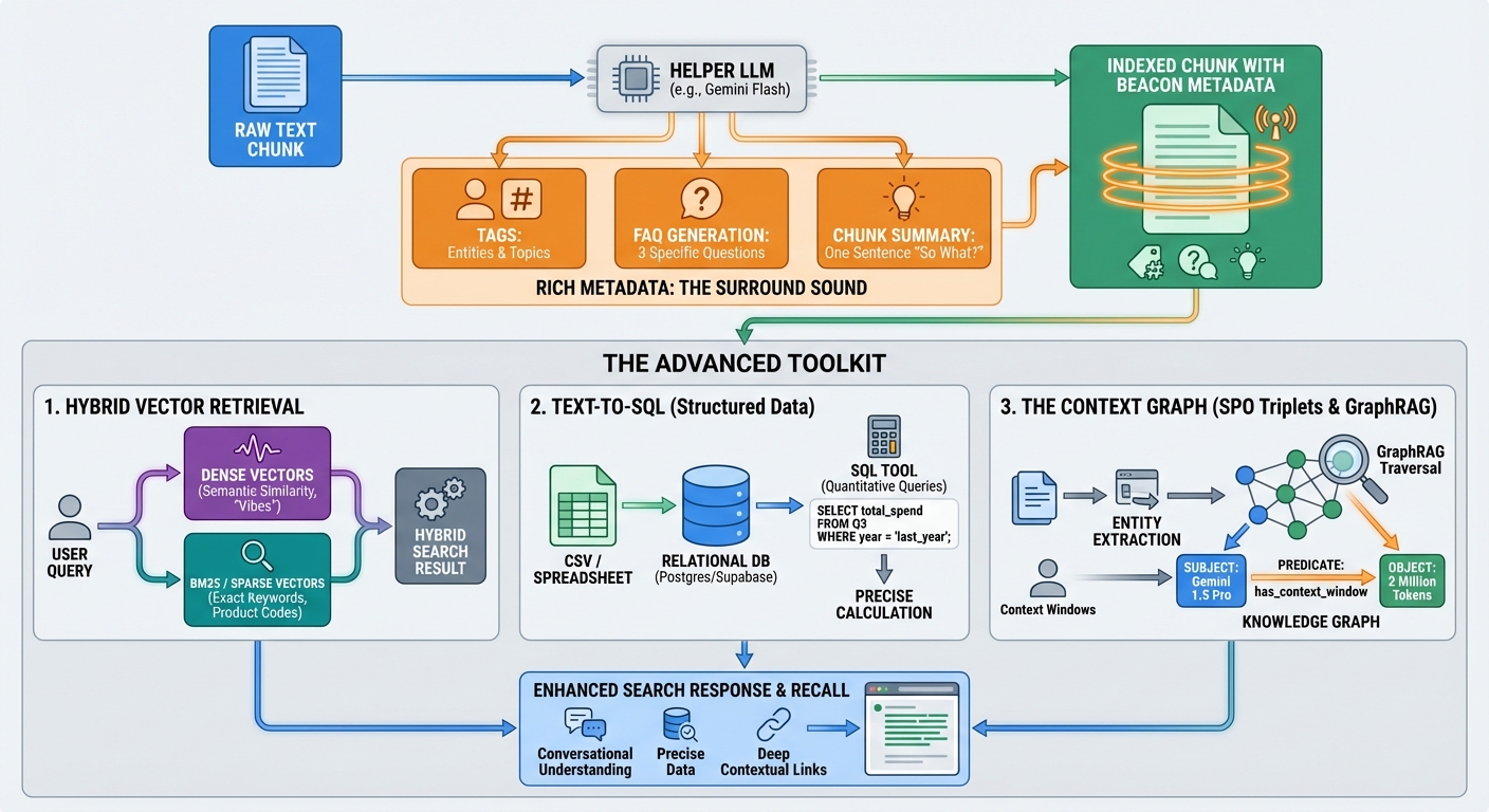 By combining the results (using something like Reciprocal Rank Fusion), you get a system that can handle both "vague questions" and "specific lookups."