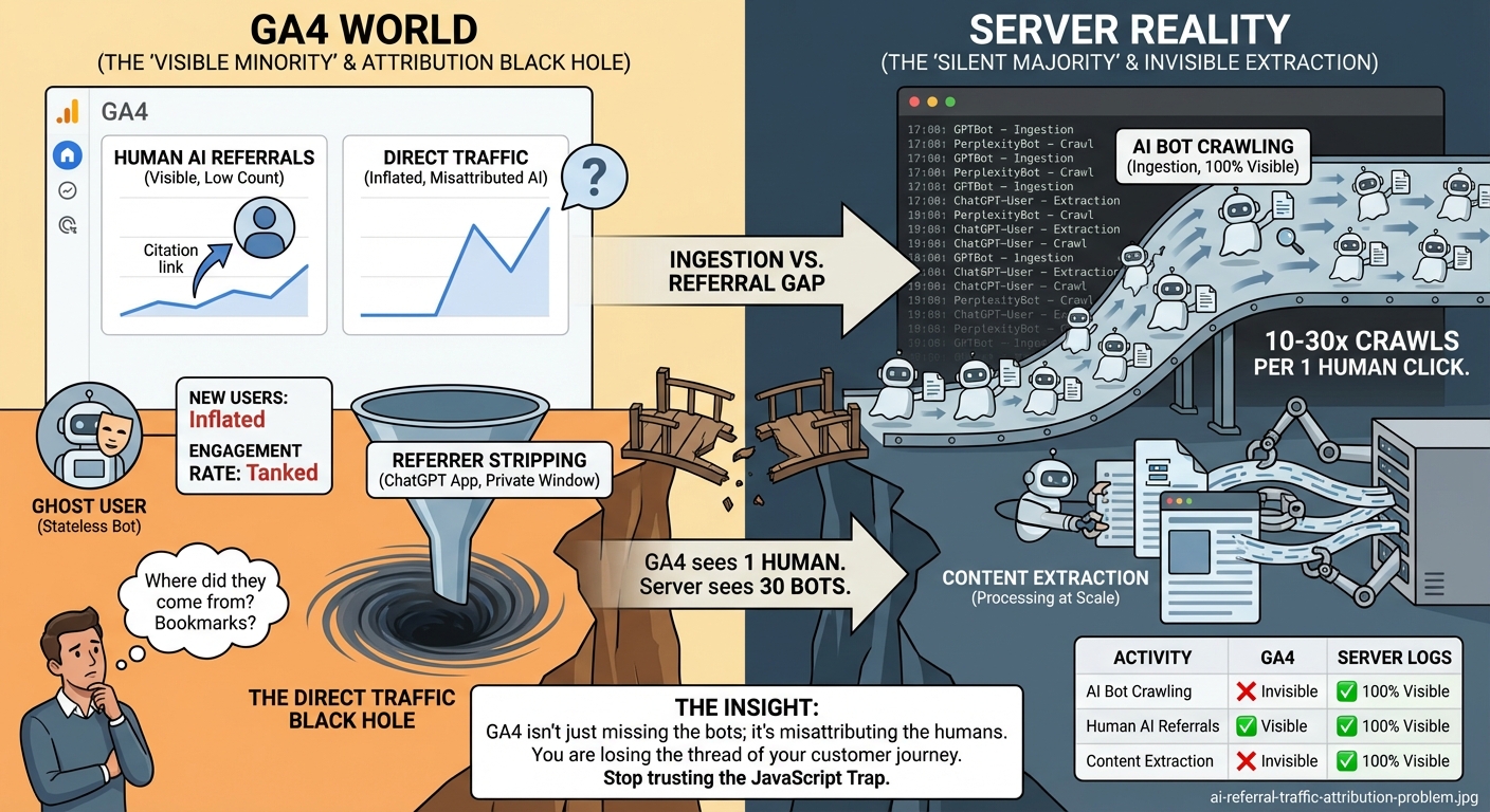 Here's the cold, hard truth: Google Analytics was built for a web where humans use browsers. It was not built for a web where LLMs use crawlers to "ingest" your site before a human ever sees a single pixel.